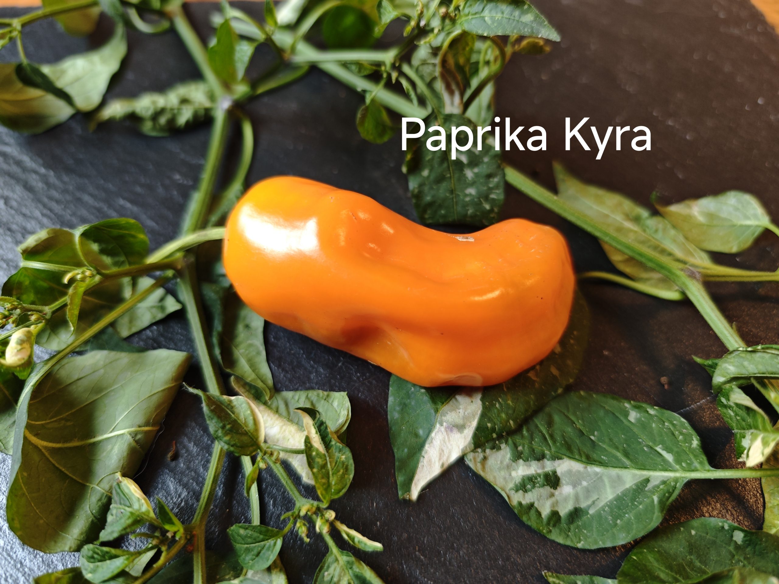 Die süße Spitzpaprika Kyra hat einen lockeren, hohen Wuchs. Die länglichen Früchte färben rasch von Hellgrün auf Orange und haben eine Länge von ca. 20-22 cm. Lange Fruchthaltbarkeit nach der Ernte. Robuste Pflanzen, die auch noch gegen Ende der Kultur bei kühlerer Witterung Früchte zur Ausreife bringen. Sehr guter, süßer Geschmack.