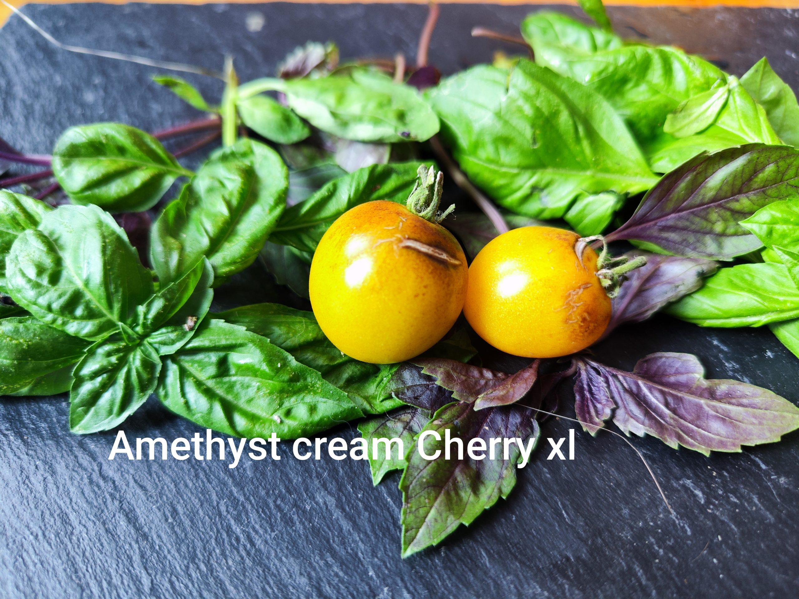 Die gelbe Cocktailtomate hat dunkle Streifen im Kelchbereich wenn die Sonne darauf scheint. Sie ist eine wenig Perlmuttfarben. Die Schale ist ultradünn, sie neigt zum Aufplatzen. Der Geschmack ist sehr süß. Ohne Säure. Sehr starker Wuchs. Sie kommt von Brad Gates aus dem Napa Valley.