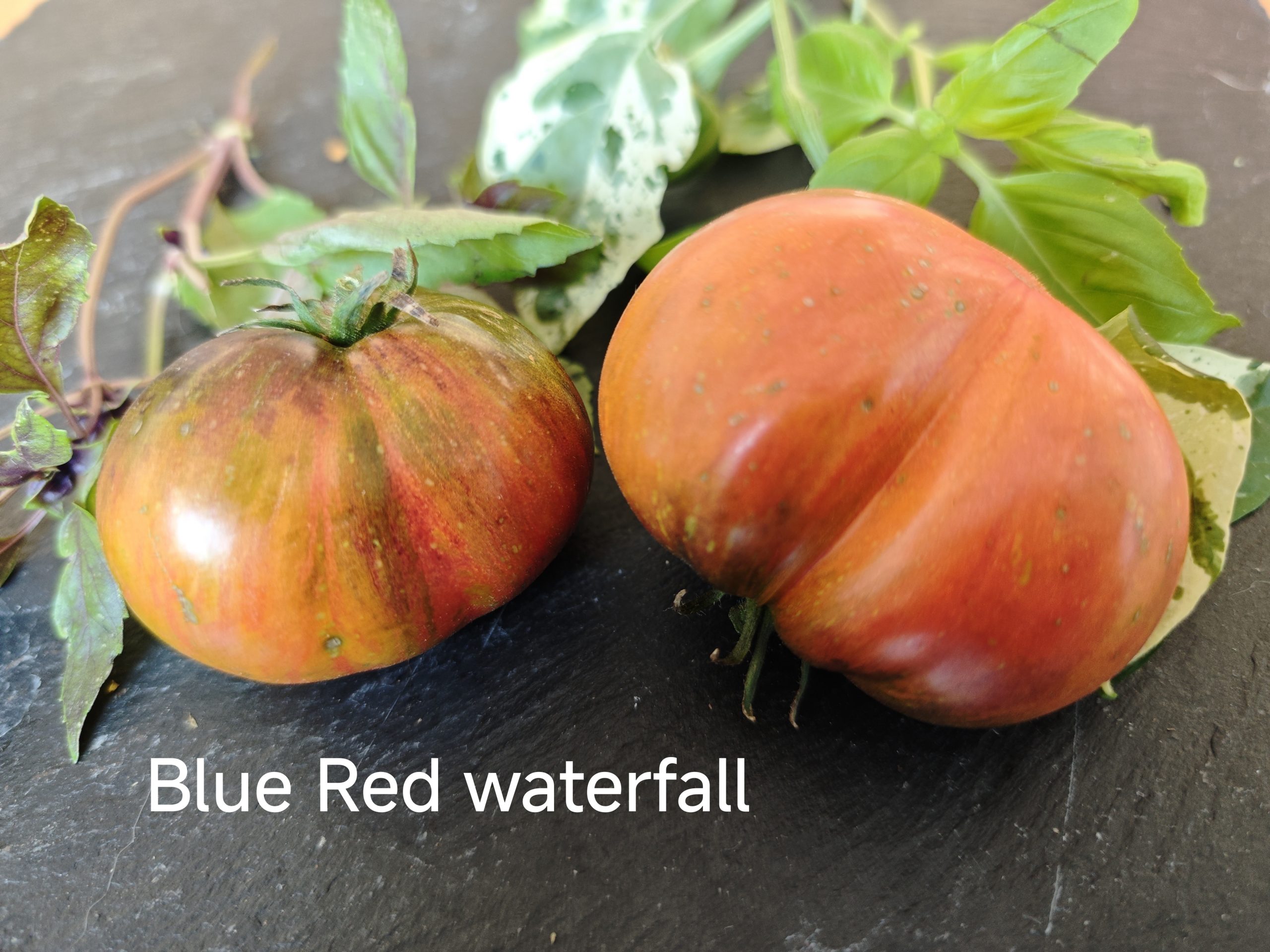 Die Sorte Blue-Red Waterfall ist eine außergewöhnlich attraktive Tomate, die sowohl durch ihr Aussehen als auch durch ihren Geschmack begeistert.