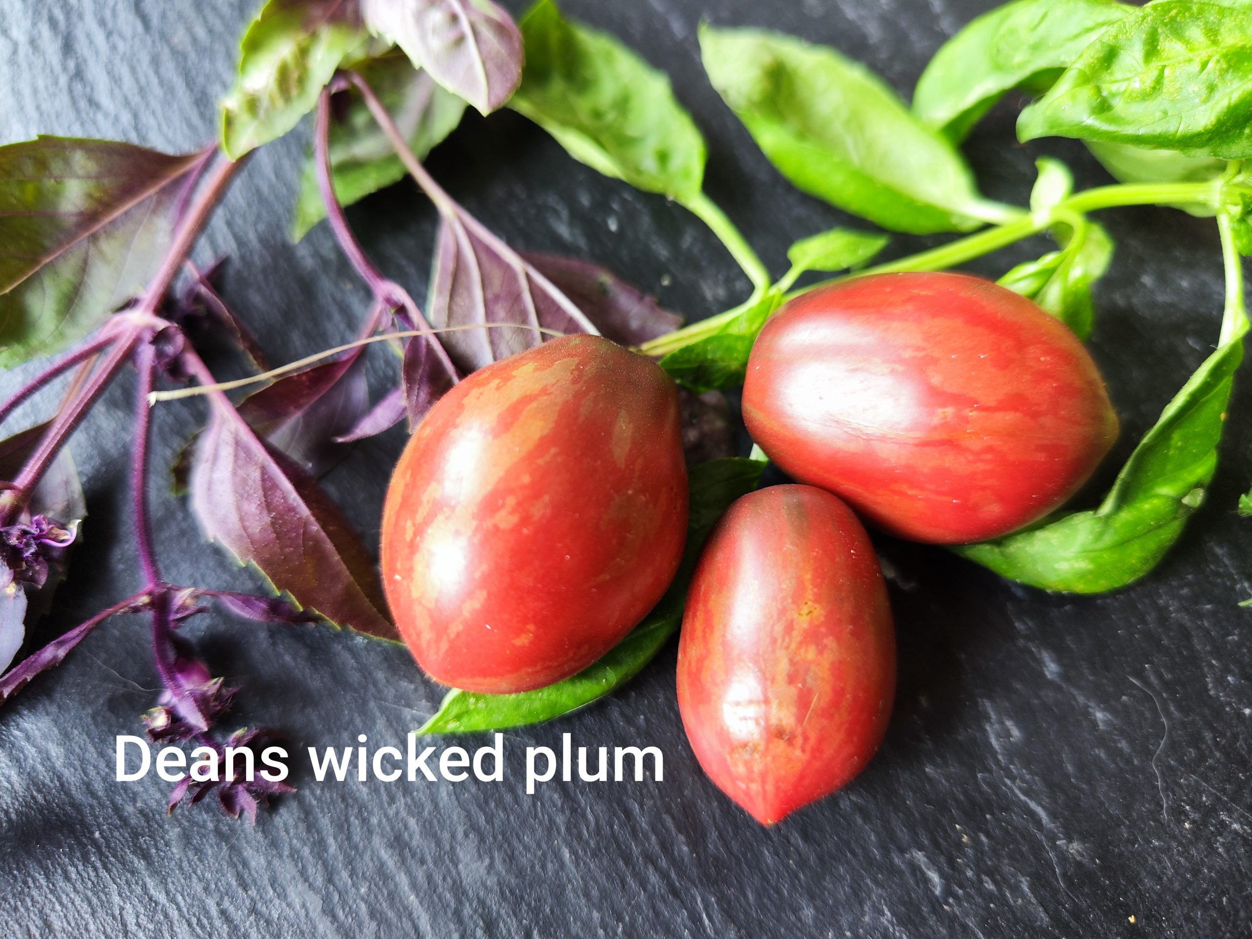Früchte: Burgunderrote Pflaumentomaten mit grünen bis metallisch schimmernden Streifen. Das Fruchtgewicht liegt bei 60?90 g. Die Tomaten zeichnen sich durch einen milden, süßen Geschmack mit vollem Aroma und geringer Säure aus.