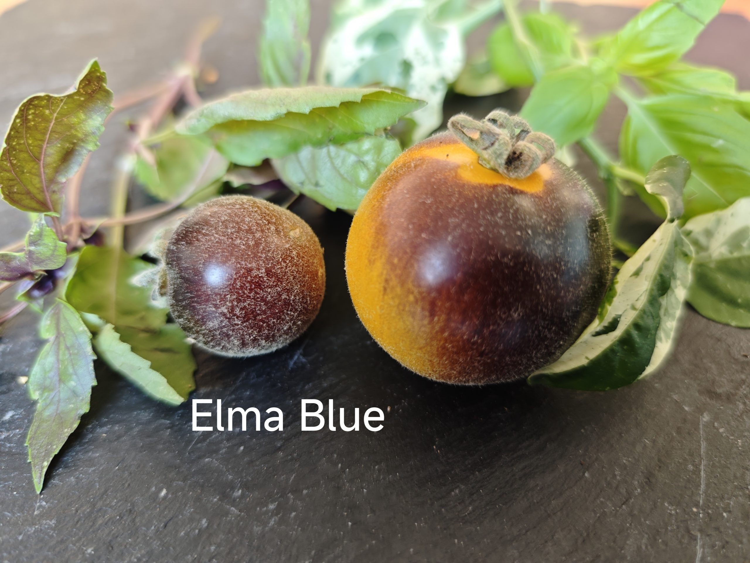 Elma Blue wurde 2011 von Tom Wagner aus Everett, Washington gezüchtet. Es handelt sich dabei um eine gänzlich behaarte Tomatensorte. Stängel, Blätter als auch die Früchte sind von einem wolligen Flaum bedeckt. Dadurch sieht die Pflanze graugrün aus. Zusätzlich zum wolligen Gen hat Tom Wagner noch eine Anthocyan-Sorte eingekreuzt. Die Früchte reifen auf ein orange-schwarz ab. Der Geschmack ist gut ausbalanciert süß-sauer. Im Gegensatz zu den meisten behaarten Sorten ist Elma Blue gut produktiv.
