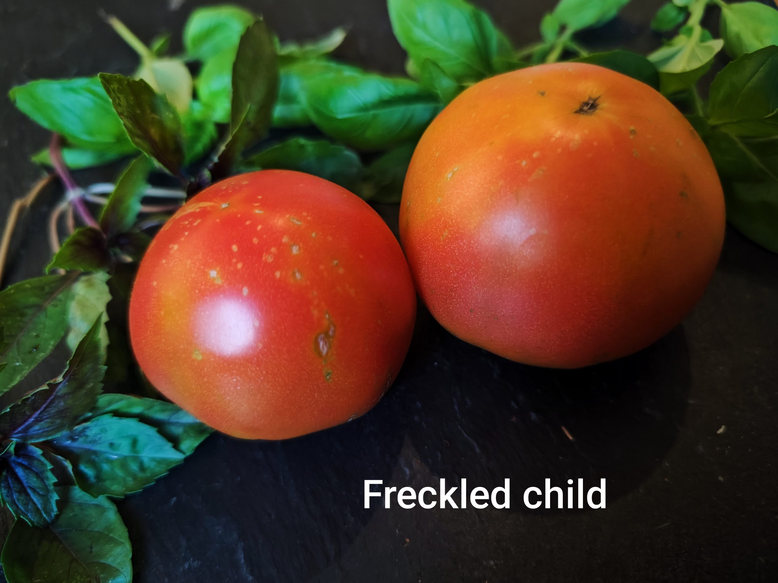 Die „Freckled Child“ ist eine außergewöhnliche Salattomate mit plattrunden, gelb-orange-roten Früchten, die 80–180 g wiegen. Sie überzeugt durch ihren süßen, fruchtigen Geschmack und extrem dünne Schale. Die mittelspät reifende Stabtomate wächst schmal, erreicht eine Höhe von etwa 2 m und liefert einen guten Ertrag, wobei die Früchte sich nur schwer lösen.