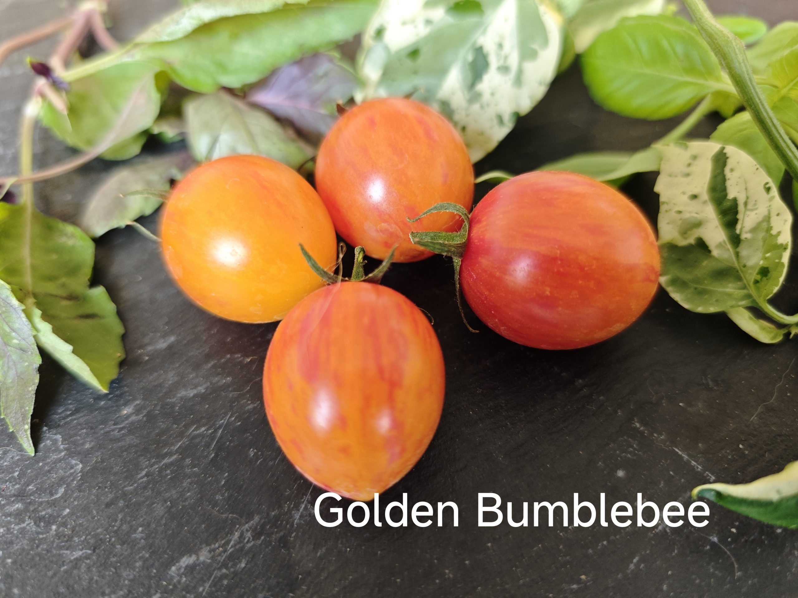 Die Tomate Golden Bumble Bee ist eine wunderschöne, gestreifte Kirschtomatensorte mit zahlreichen Früchten von ca. 23 g. Die kleinen Tomaten haben eine wunderschöne tiefgelbe Farbe mit orangefarbenen Streifen.