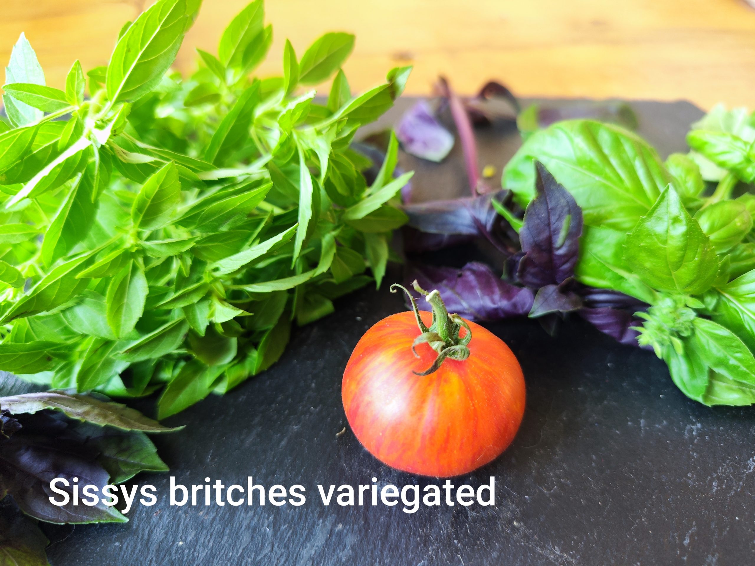 Eine Sorte mit panaschiertem Laub! Die Früchte sind rot mit gelben Streifen, aromatisch im Geschmack. Inhalt: 10 Samenkörner Inhalt: mind. 10 Samen