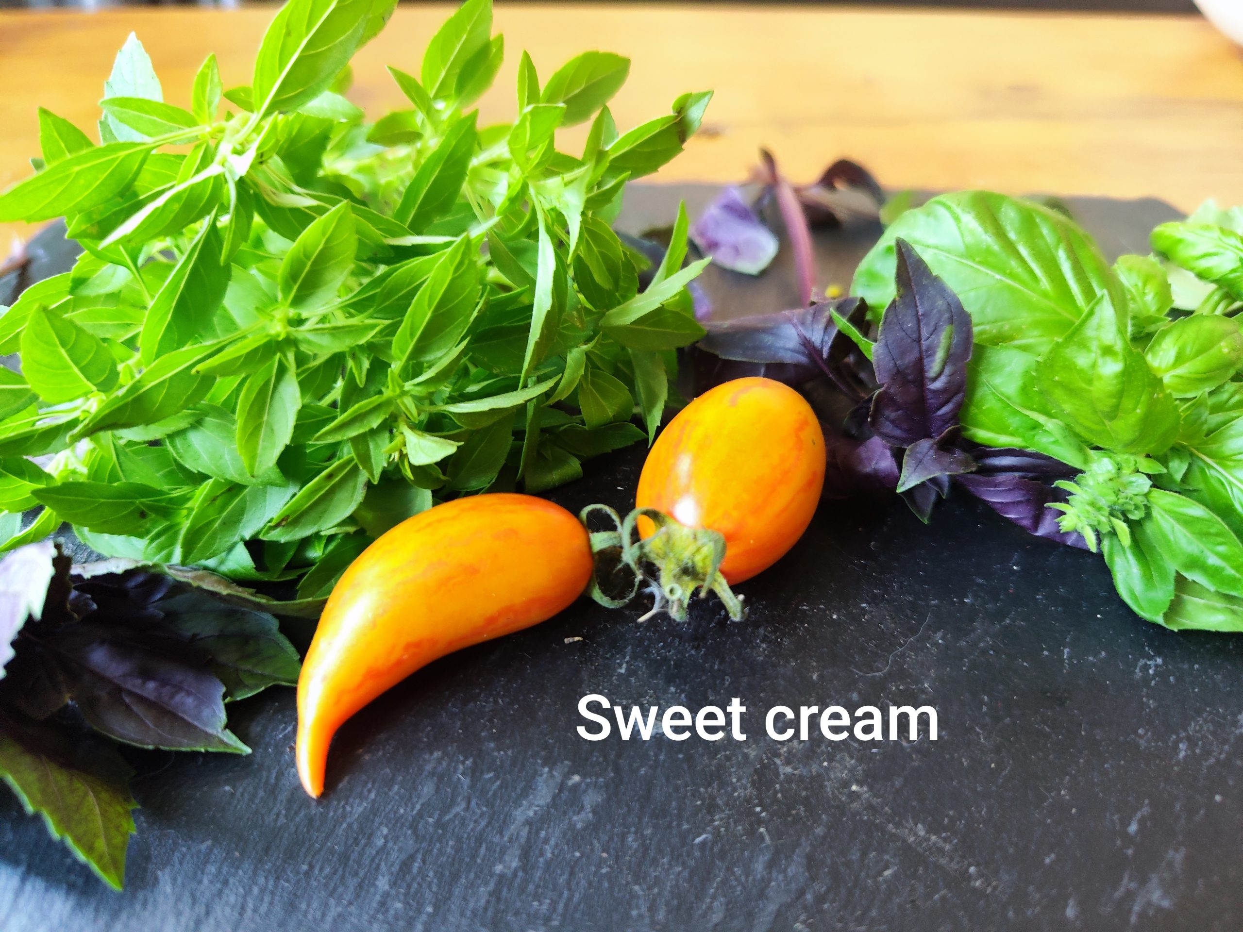 Sweet Cream produziert wunderschön gefärbte längliche Tomaten in einem gelb-orangen Kleid. Die länglichen Früchte werden 30 bis 50 Gramm schwer, stecken voll süß-fruchtigem Geschmack, platzen praktisch nie und sind lange haltbar. Aber wer will schon eine so gut schmeckende Tomate lange aufheben? Danke, Brad Gates, dass Du uns wieder eine solch tolle Tomate beschert hast!