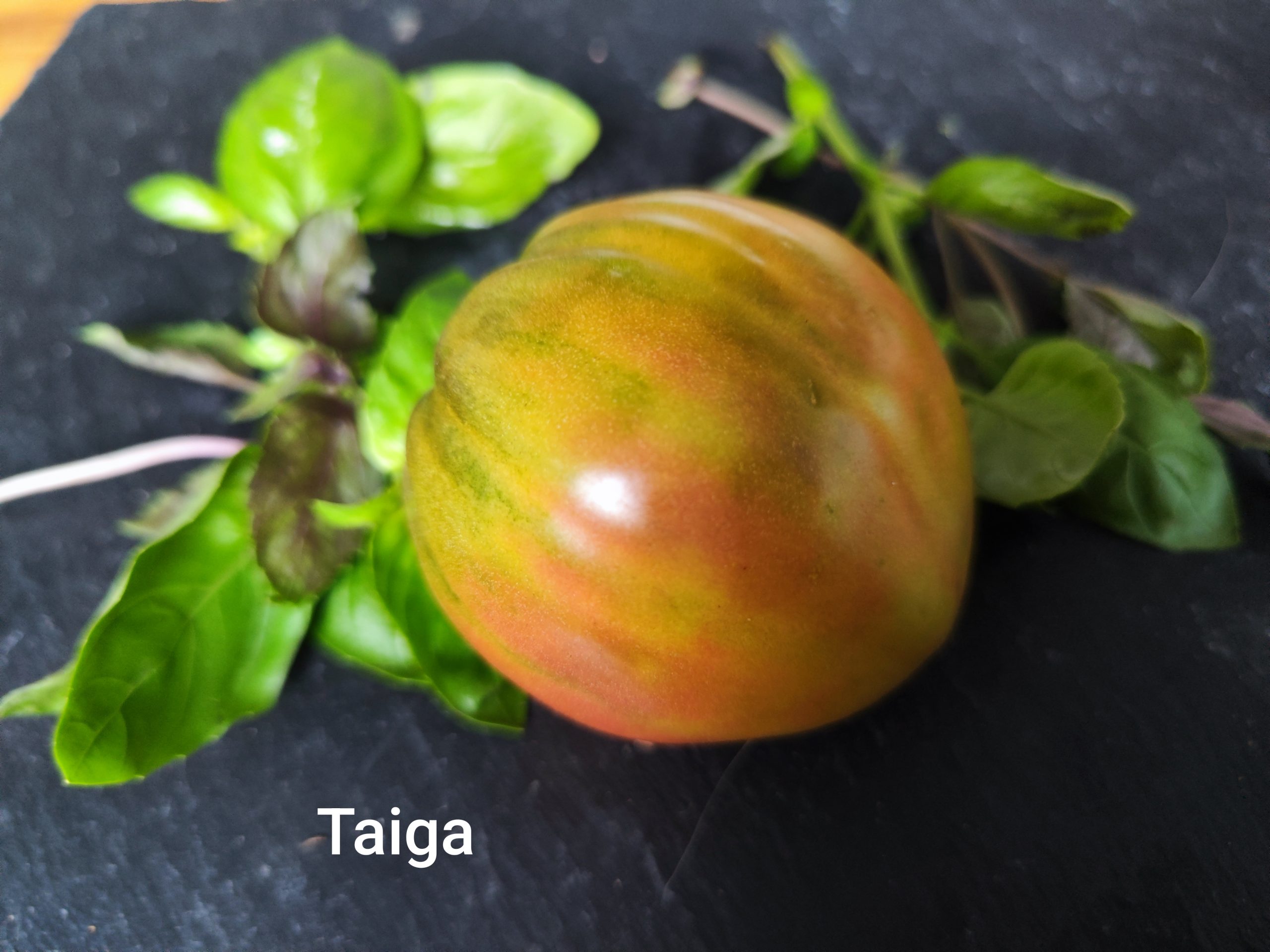 Alle Sorten der True North Serie sind spektakulär gefärbt. Auch Taiga sieht umwerfend aus, besonders, wenn man die Früchte aufschneidet. Das Fruchtfleisch ist grün bis gelb und hat eine rosa Marmorierung. Der Geschmack ist süß-fruchtig. Wie viele Ochsenherztomaten hat auch Taiga stark herabhängendes Laub. Das sieht insofern ungewöhnlich aus, da die Sorte kartoffelblättrig ist. Bei all den tollen Sorten von Karen Olivier ist es wirklich schwierig, sich zu entscheiden, am besten probiert man einfach alle aus.