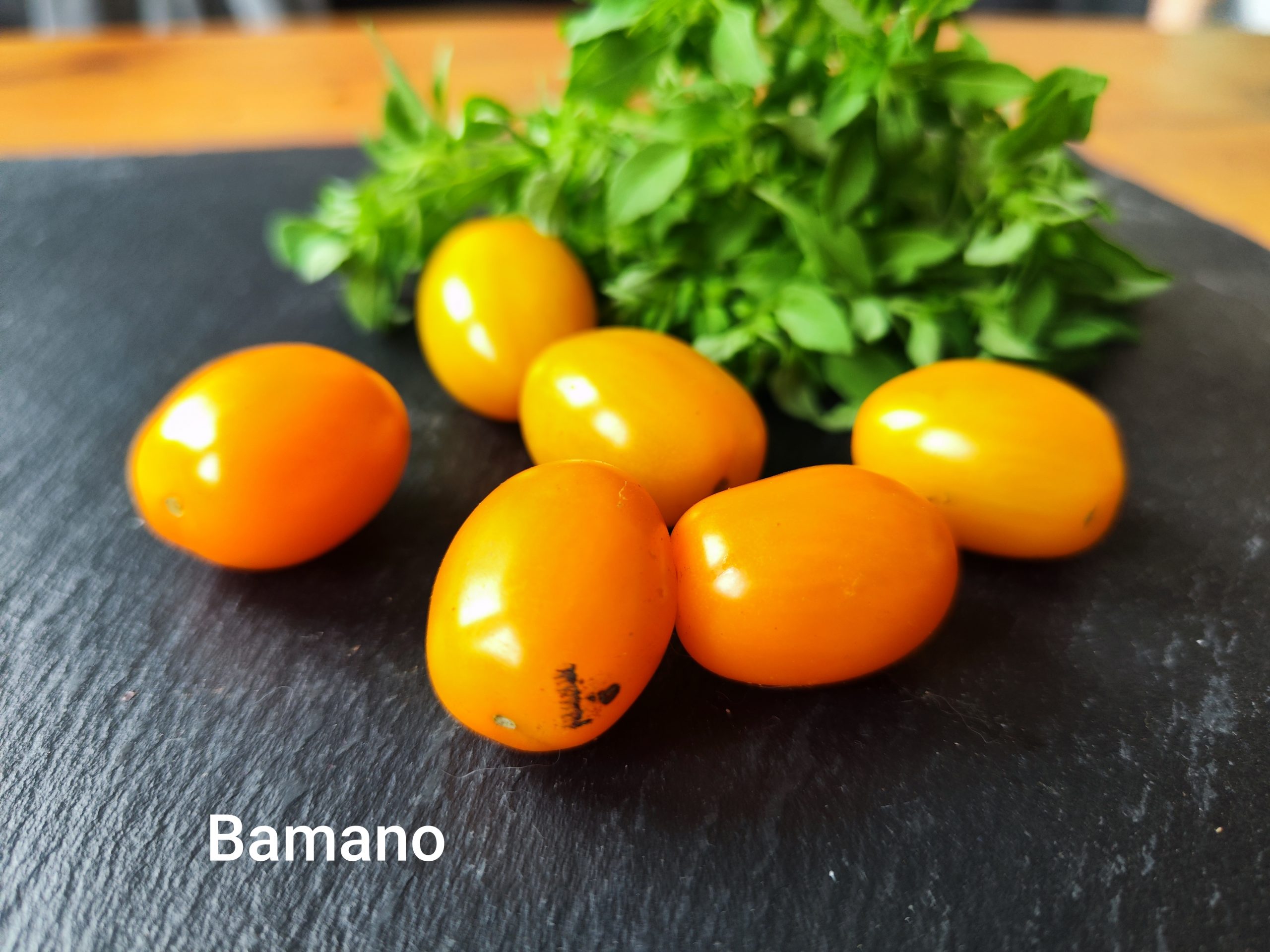 Die „Bamano“ ist eine spezielle, baby-pflaumenförmige Tomatensorte mit auffälliger orangefarbener Schale und einem Gewicht von 11-12 Gramm, die einen sehr guten, süßen Geschmack bietet. Die Sorte ist bekannt für ihre generativen Pflanzen mit schnellem Wuchs, hoher Verzweigung für hohe Erträge und einer besonders guten Haltbarkeit