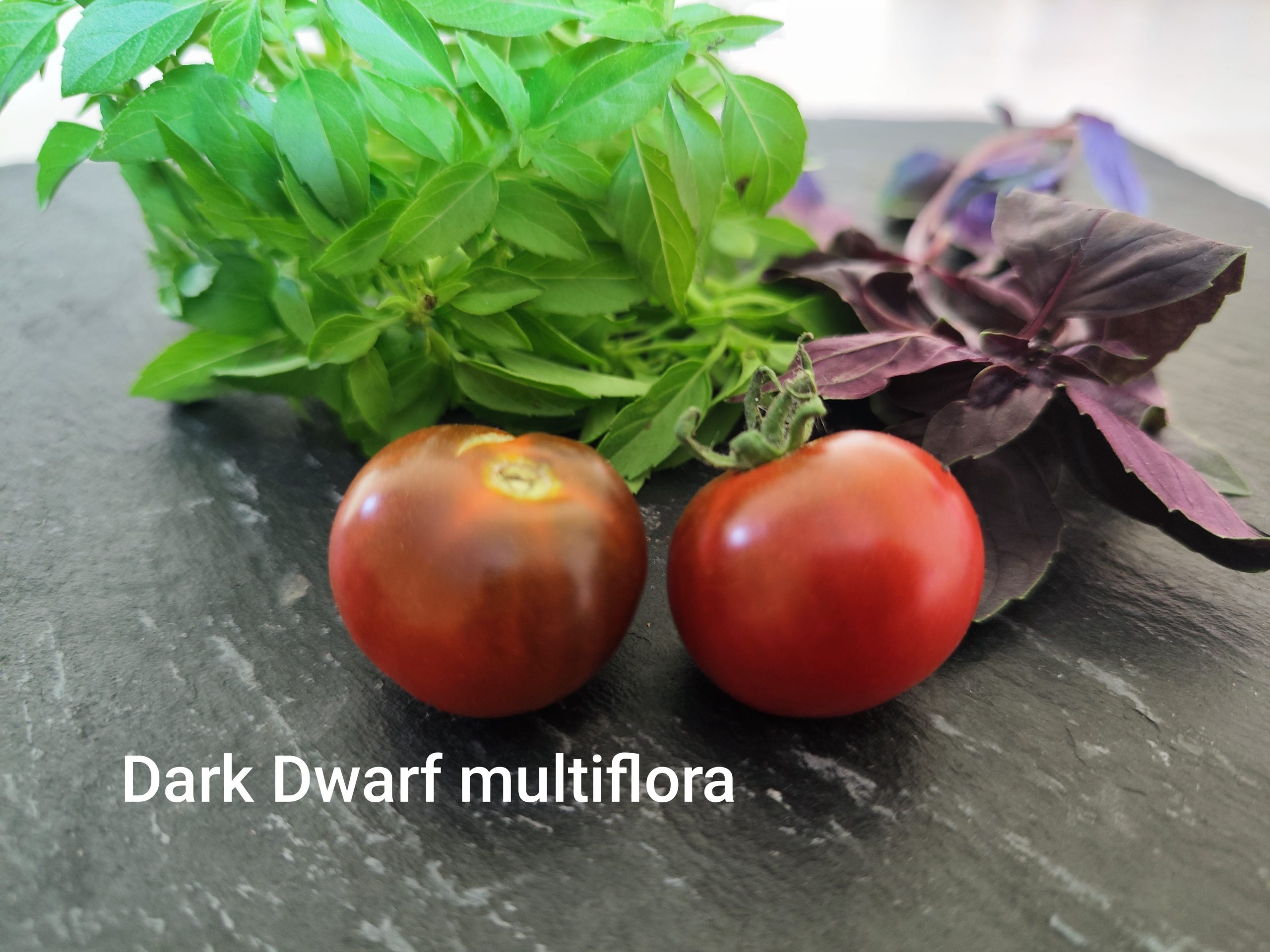 Höhe: ca. 0,60 m Eine kleinwüchsige Multiflora-Sorte mit braunen Früchten. Diese schmecken sehr süß und würzig. Die kleine Pflanze ist sehr produktiv, ist ja auch eine Multiflora! (Dwarftomaten sind Tomatensorten, die für ihren kompakten Wuchs bekannt sind und sich daher optimal für den Anbau in Kübeln eignen.Sie sind perfekt für ein Plätzchen auf dem Balkon…
