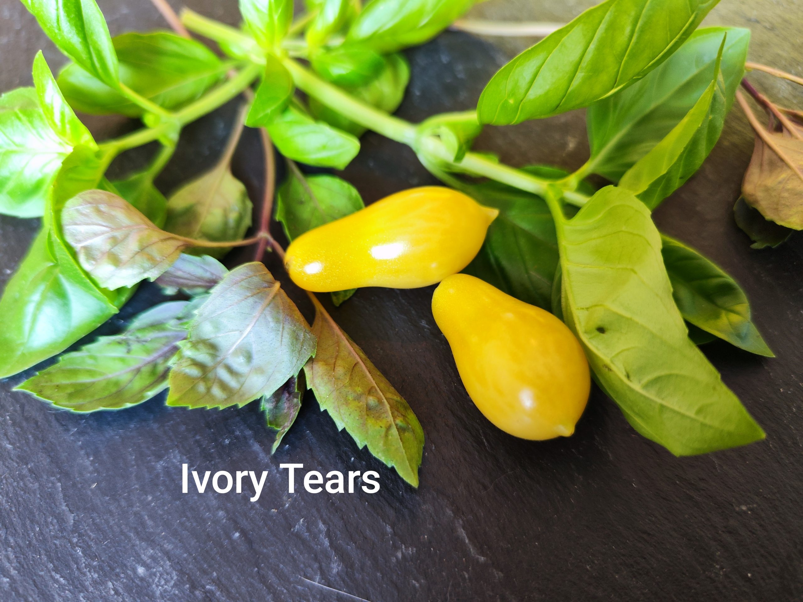 Ivory Tears entstand aus einer Zusammenarbeit zwischen Phillip Vermeulen & Gerd Fraeyman aus Belgien und wurde im Jahr 2020 veröffentlicht. Die Früchte haben eine langgezogene Birnenform und schmecken sehr süß und fruchtig. Die Pflanzen sind sehr wüchsig, entwickeln aber nur ein lichtes Laubwerk, sicher kein Nachteil im Freilandanbau. Der Ertrag ist hoch. Ivory Tears ist eine schöne elfenbeinfarbige Sorte mit außergewöhnlicher Fruchtform und gutem Geschmack.