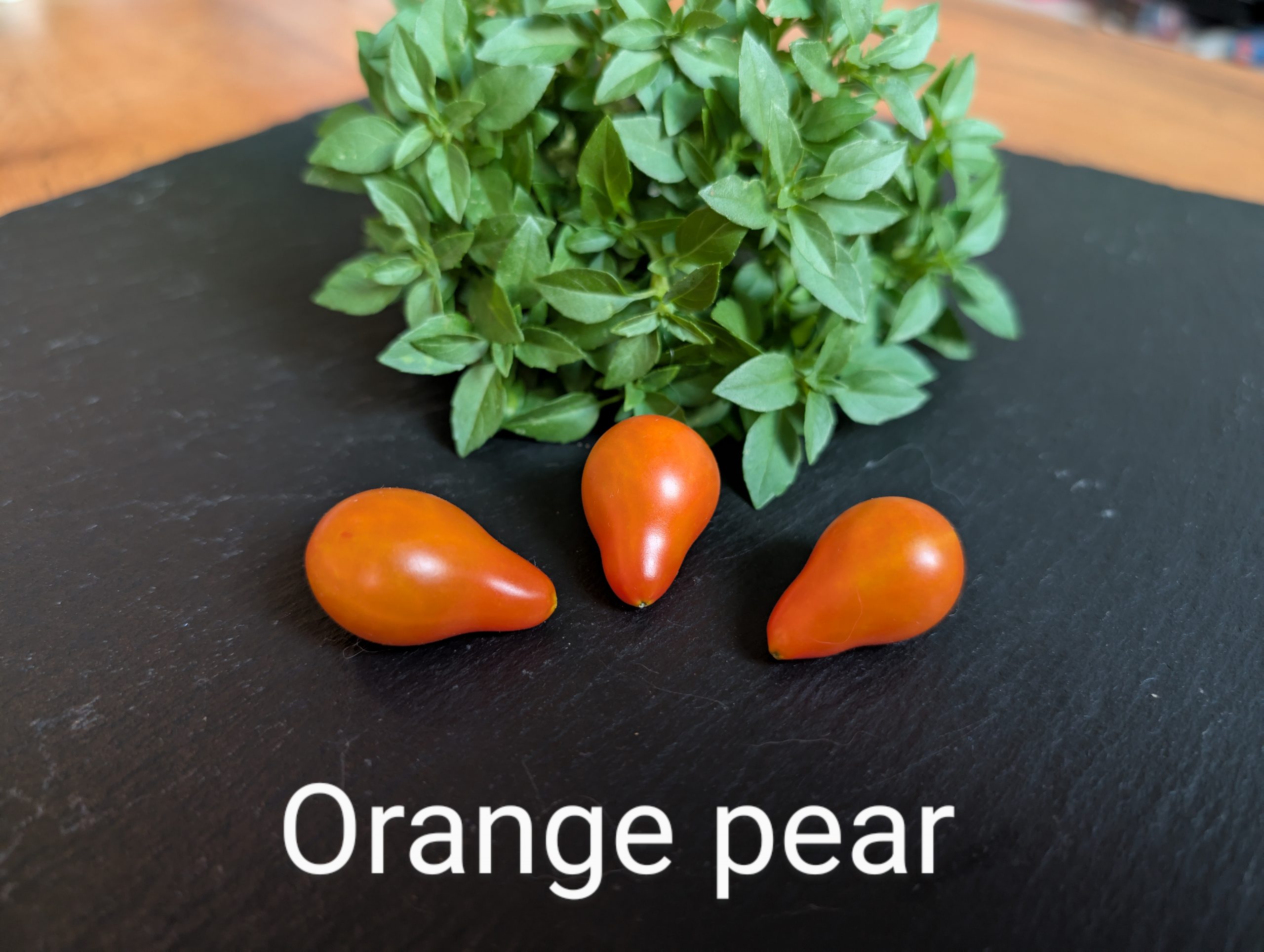 „Orange Pear“ ist eine Tomatensorte, die eine orange-farbene, birnenförmige Kirschtomate hervorbringt. Die Sorte wächst kräftig, wird bis zu zwei Meter hoch und liefert viele süße, aromatische Früchte an langen Rispen. Die Tomaten sind für ihren fruchtig-süßen Geschmack bekannt und eignen sich für den Anbau im Gewächshaus, im geschützten Freiland oder in Kübeln auf dem Balkon. Eigenschaften der Tomate „Orange Pear“