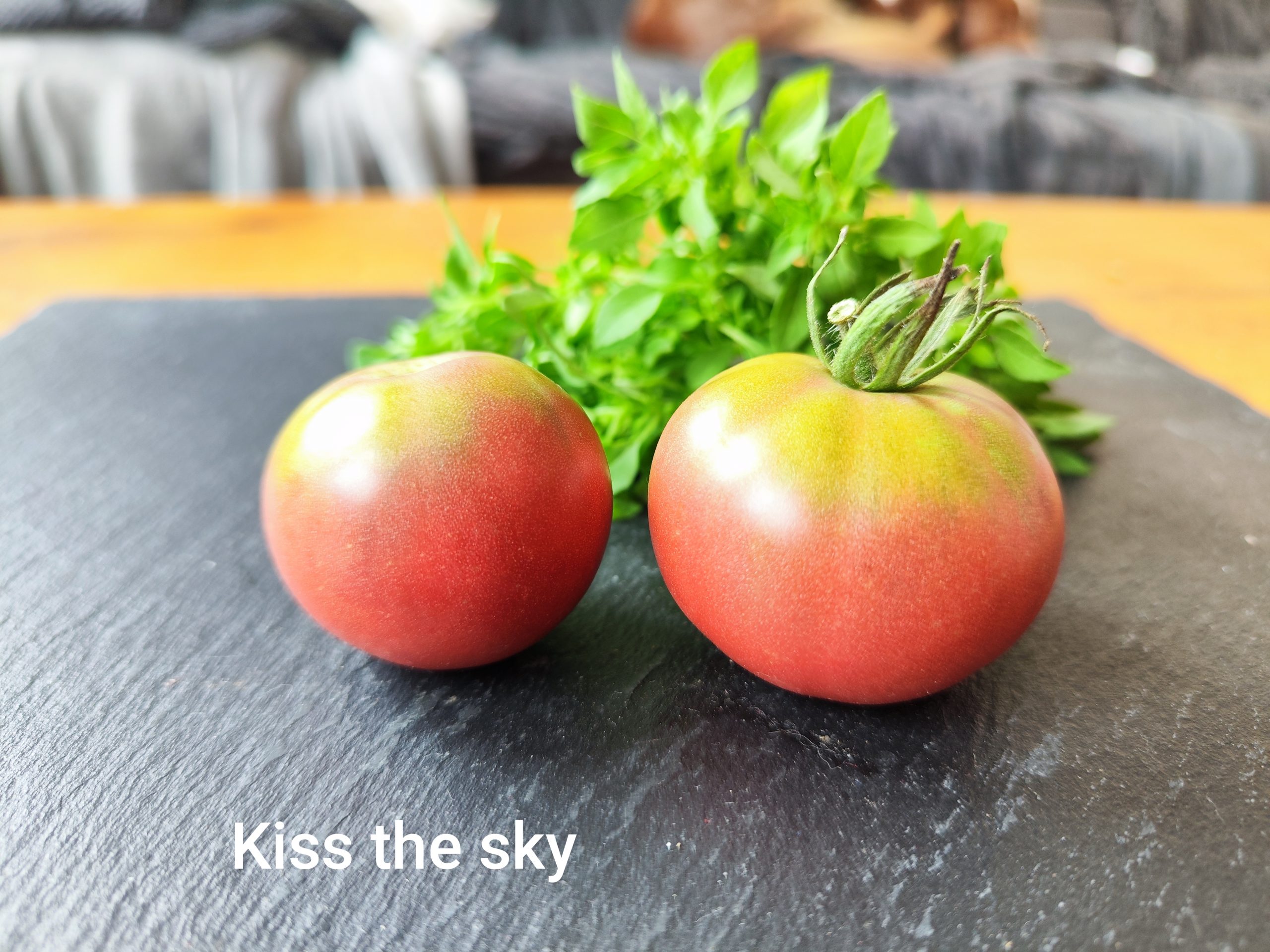 „Kiss the Sky“ ist eine Sorte einer dunklen Tomate, die von Tatiana Kouchnareva aus der Linie „Purple Haze“ entwickelt wurde. Die Früchte sind klein bis mittelgroß (ca. $25-40$g), haben eine braun-violette Farbe mit dunklen Schultern und einen süßen, leicht rauchigen Geschmack. Die Pflanze ist ertragreich, wächst buschig und unbestimmt bis zum ersten Frost. Eigenschaften der Tomate „Kiss the Sky“