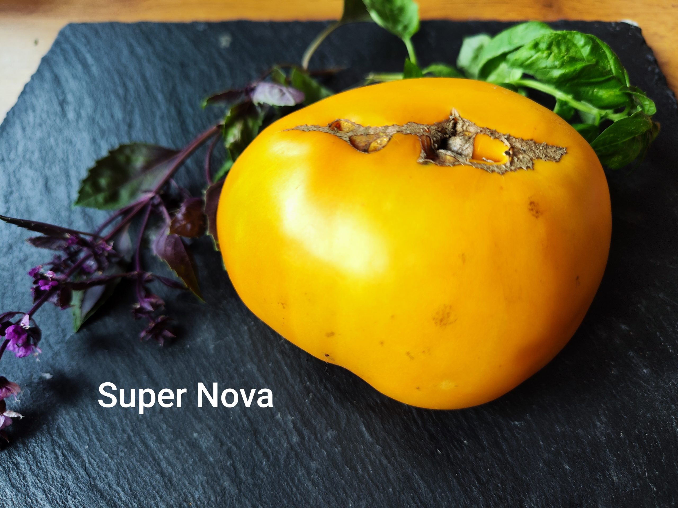 Super Nova produziert abgeflachte, große Fleischtomaten mit einem Gewicht von etwa 300–600 g pro Stück. Goldorange Früchte mit dunkelorangem Fruchtfleisch. Kräftiger, süßer, saftiger Tomatengeschmack. Unbestimmt wachsend. Aus den USA. Reifezeit: ca. 85 Tage. 10 Samen pro Packung.